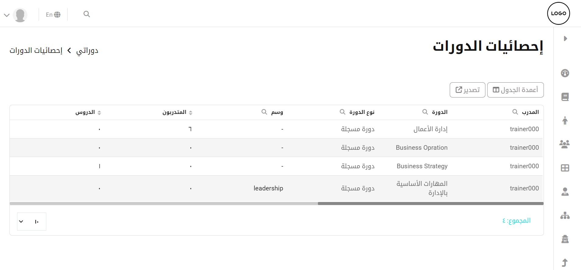 - يٌمكنك عرض إحصائيات جميع الدورات التي تم إنشائها على المنصة من خلال جدول إحصائيات الدورات الذي يظهر.