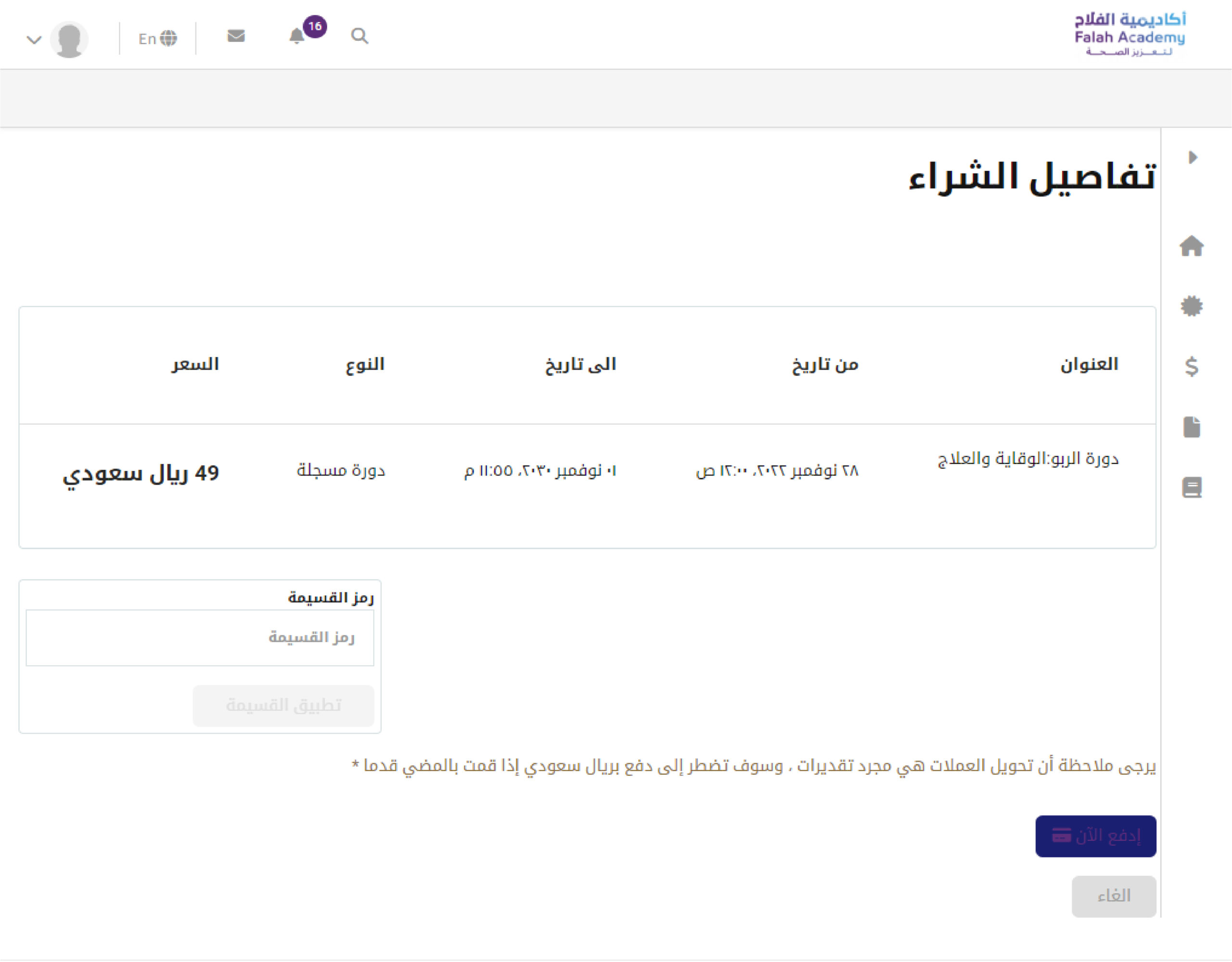 ٢ - تفاصيل الدفع للدورة هو العنوان، (تاريخ البداية/تاريخ الانتهاء)، النوع (مسجلة أو مباشرة)، السعر، استخدم رمز القسيمة ثم اضغط على "ادفع الآن".