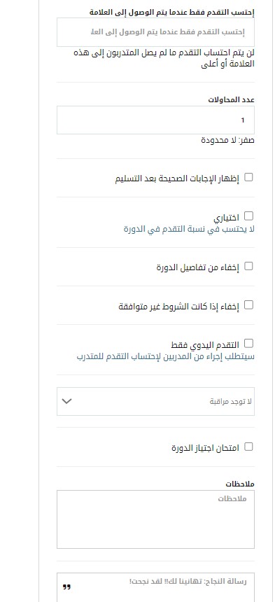 إظهار الإجابات الصحيحة بعد التسليم: يتيح لك هذا تحديد ما إذا كنت ترغب في مشاركة الإجابات النموذجية أم لا، وإذا كانت الإجابة نعم، متى تريد مشاركتها؟ الخيار الثالث (موصى به) يضمن أن المتدربين لا يمكنهم مشاركة الإجابات أثناء وقت الامتحان.