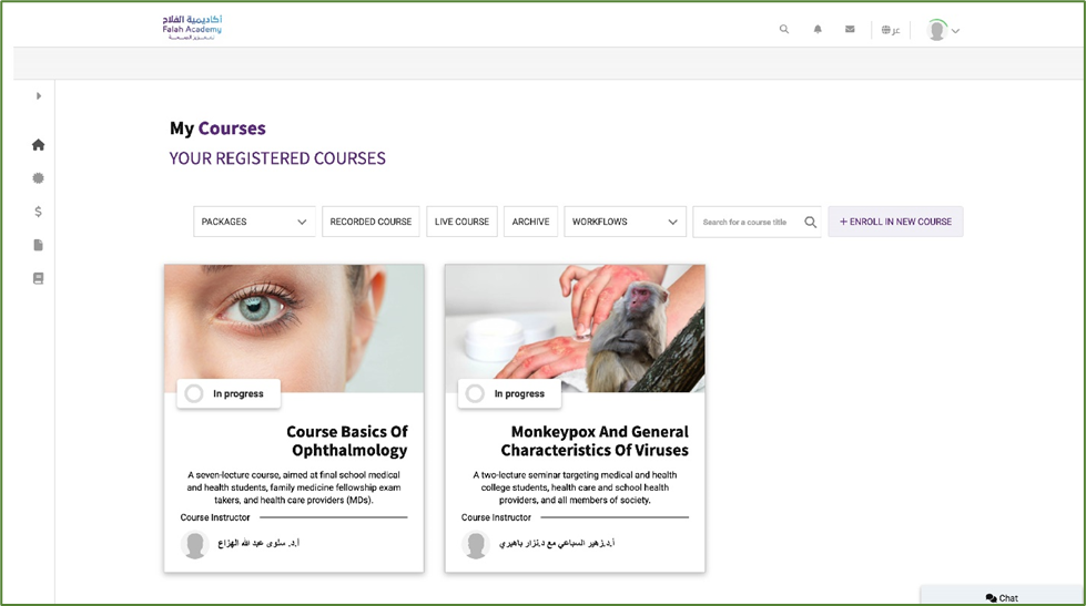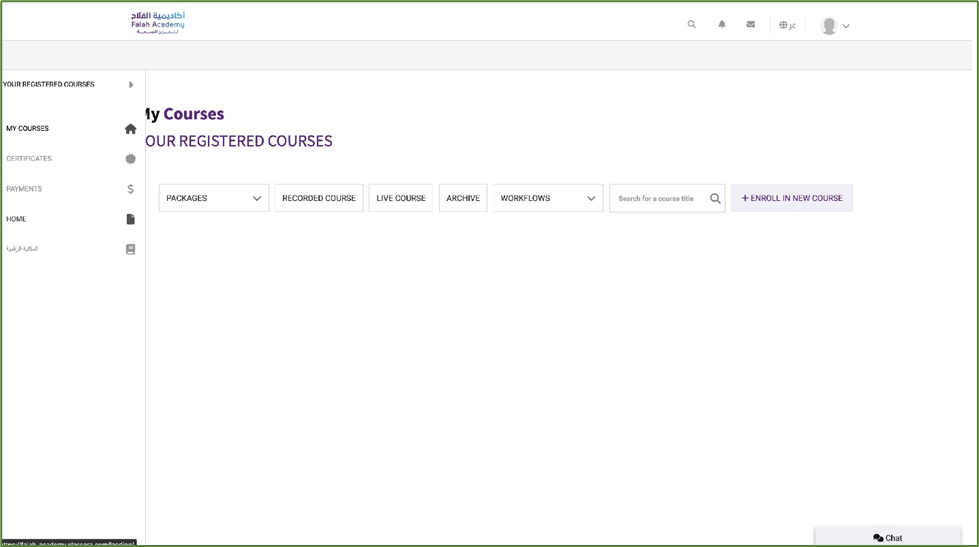 It includes your profile, notifications, emails, a switch language option, and a search box allowing users to look up anything by simply typing it down. It also has a logo icon where users can browse courses and packages.