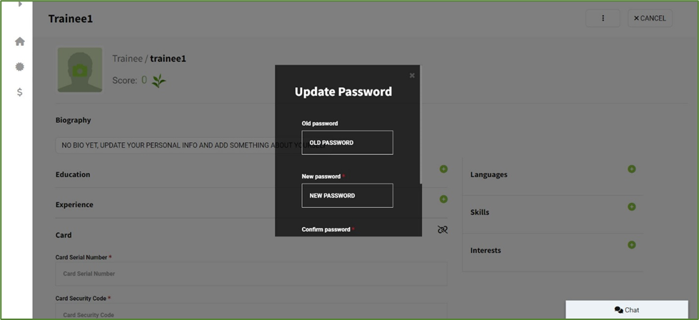 1. Update the password, write down your old password, then the new password, and confirm the password.