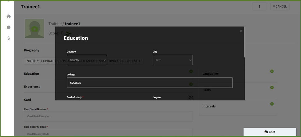 2- Add your education, click the country drop–down list and choose the country, click the city drop–down list and choose the city, fill in the college field; then choose your field of study and your degree.